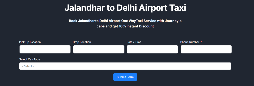 With Journeyio Cabs, you can book a Jalandhar to Delhi Airport taxi at an affordable one-way price. Our service ensures comfortable vehicles, experienced drivers, and transparent pricing with no hidden charges.